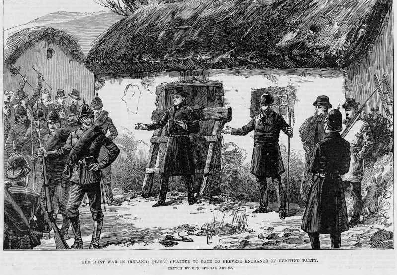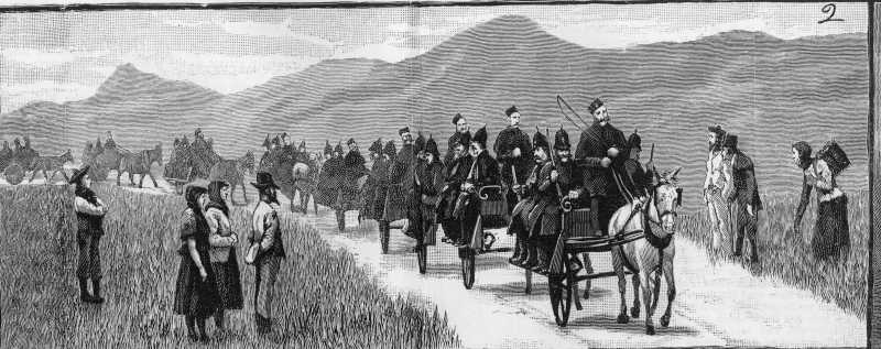 Sketch captioned "Driving on cars to the estate where the tenants are to be evicted", from Illustrated London News, May 1st, 1886