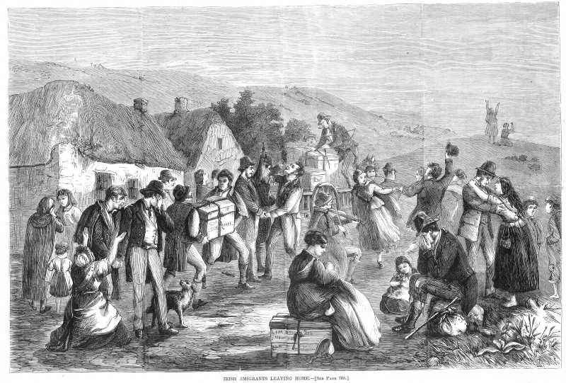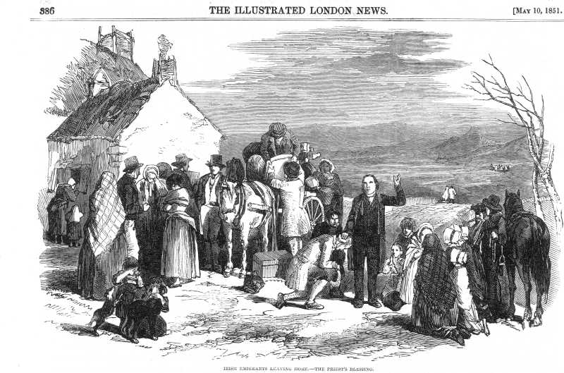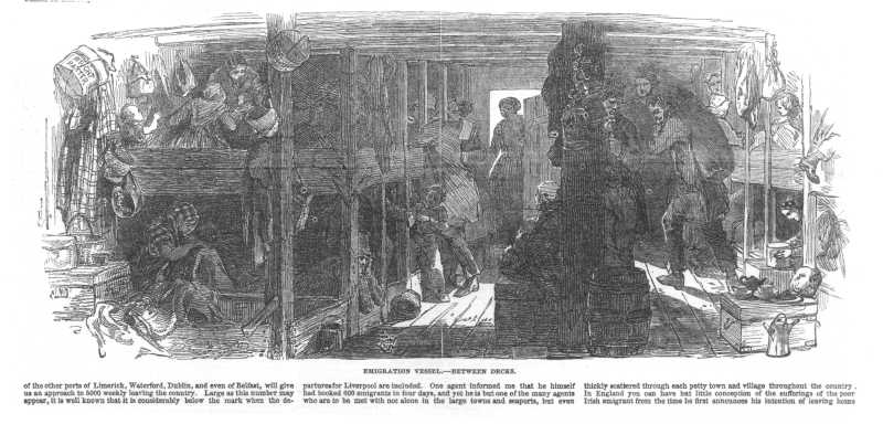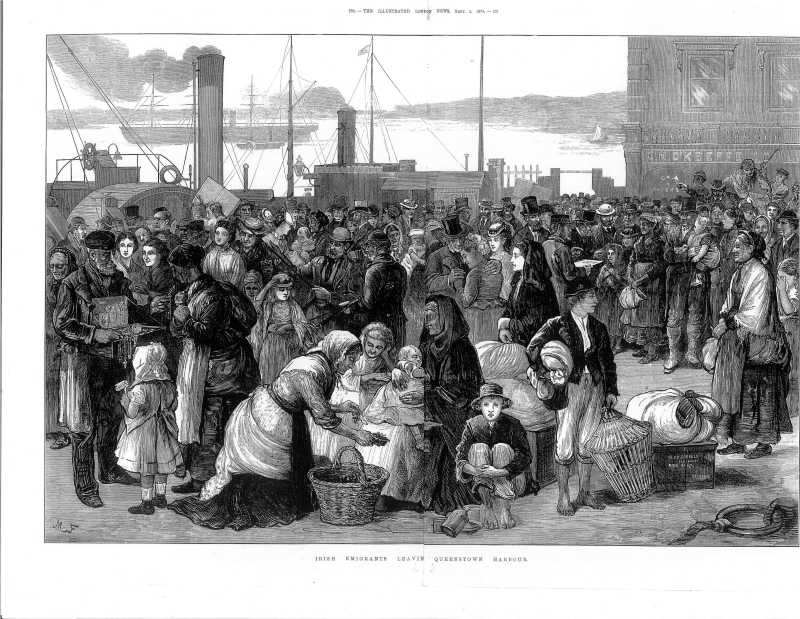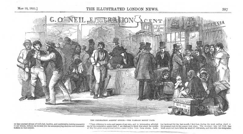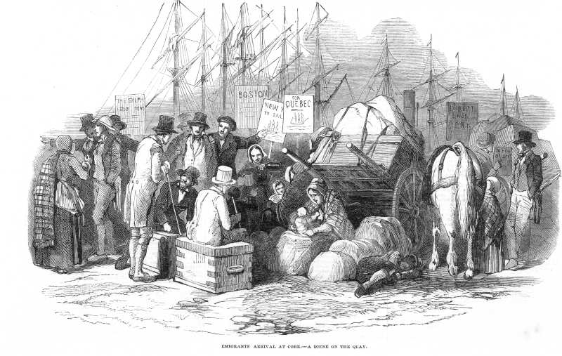 Sketch captioned "Emigrants arrival at Cork a scene on the quay" from Illustrated London News, May 10 1851