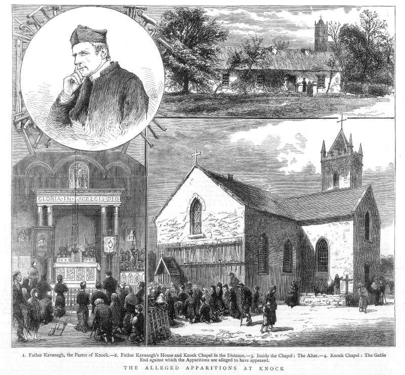 Four illustrations, captioned "The alleged apparitions at Knock", depicting Fr. Kavanagh, Pastor of Knock; Fr. Kavanagh's house; exterior and interior of Knock chapel. From "The Graphic" July 17 1880.