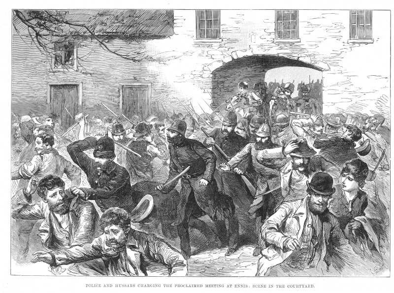 Sketch captioned "Police and hussars charging the proclaimed meeting at Ennis". From Illustrated London News Apr 21 1888.