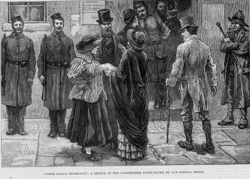 Sketch entitled "Under police protection" depicting scene outside Claremorris court-house during the holding of the Land Court.