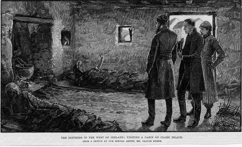 Sketch entitled "the distress in the West of Ireland: visiting a cabin on Clare Island. From Illustrated London News, April 10th, 1886