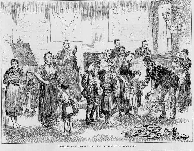 Sketch showing children being issued with clothes in a west of Ireland schoolhouse. From Illustrated London News, May 9th, 1891.